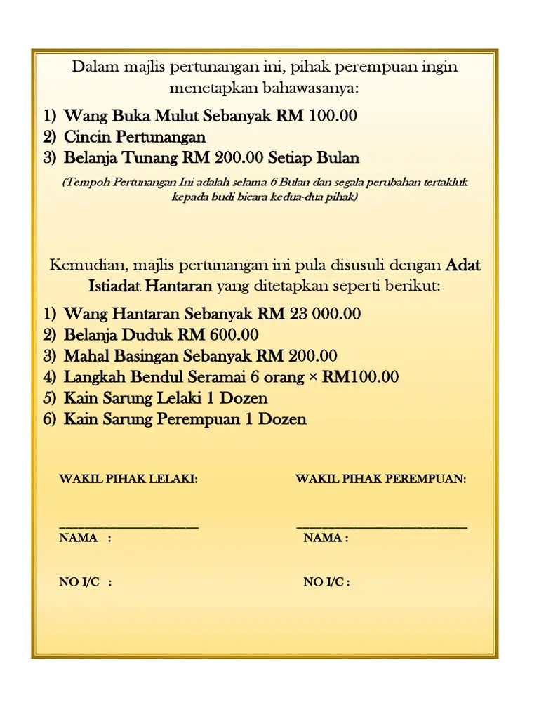 Watikah pertunangan assalammualikum warahmatullahi wabarakatuh alhamdullilah bersyukur kehadrat allah s.w.t dengan limpah rahmatnya dengan . Majlis pertunangan ini disusuli dengan adat istiadat hantaran seperti berikut: